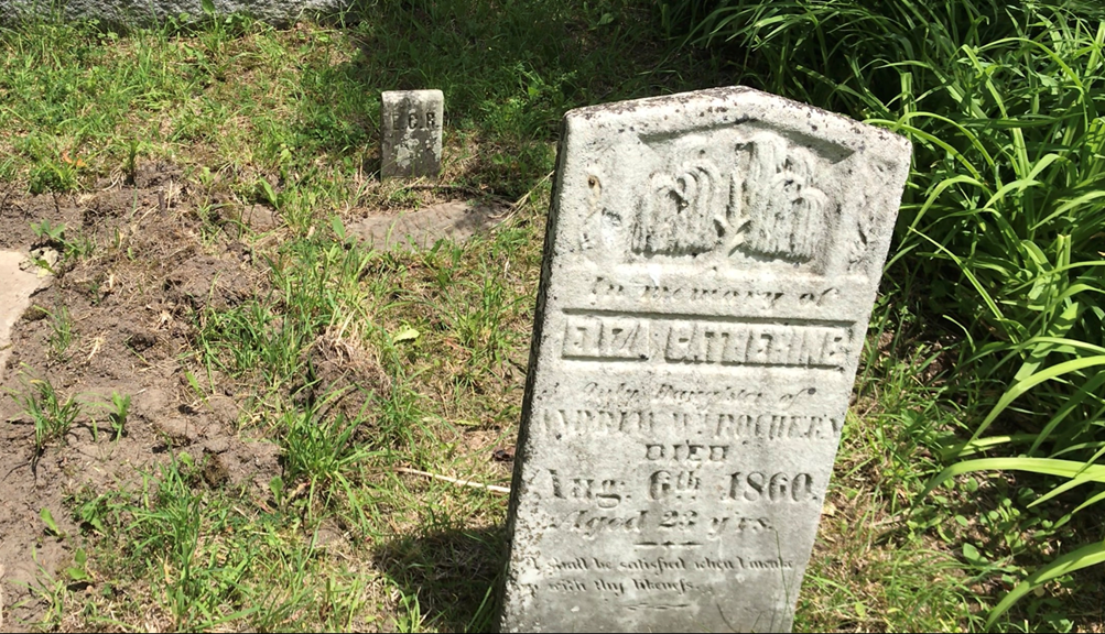 进得园内,正前方一大簇鲜绿的萱草陪伴着一白色扁碑,后面安葬着斯克芮文年仅23岁的未婚妻凯瑟琳(Eliza Catherine Roche,1837–1860)。