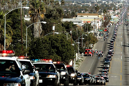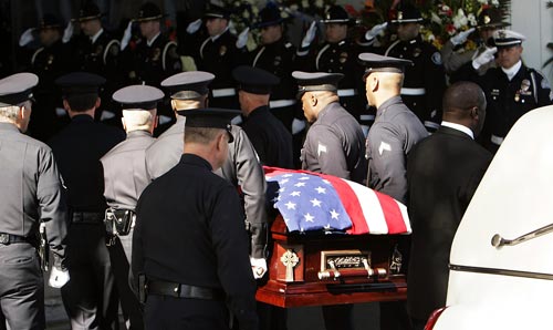 第二个第一,是他创造了洛杉矶警察局有史以来最大的一次葬礼。沿途自发送葬的人群高达上万人。单是警察,就有好几千人出席他的追思礼拜和葬礼。不仅来自美国各地,甚至有加拿大和世界其他地方的警察。送葬的警车和摩托车绵延数里,天空上有4架警察局的直升飞机护送。那个哀荣,是空前绝后的。