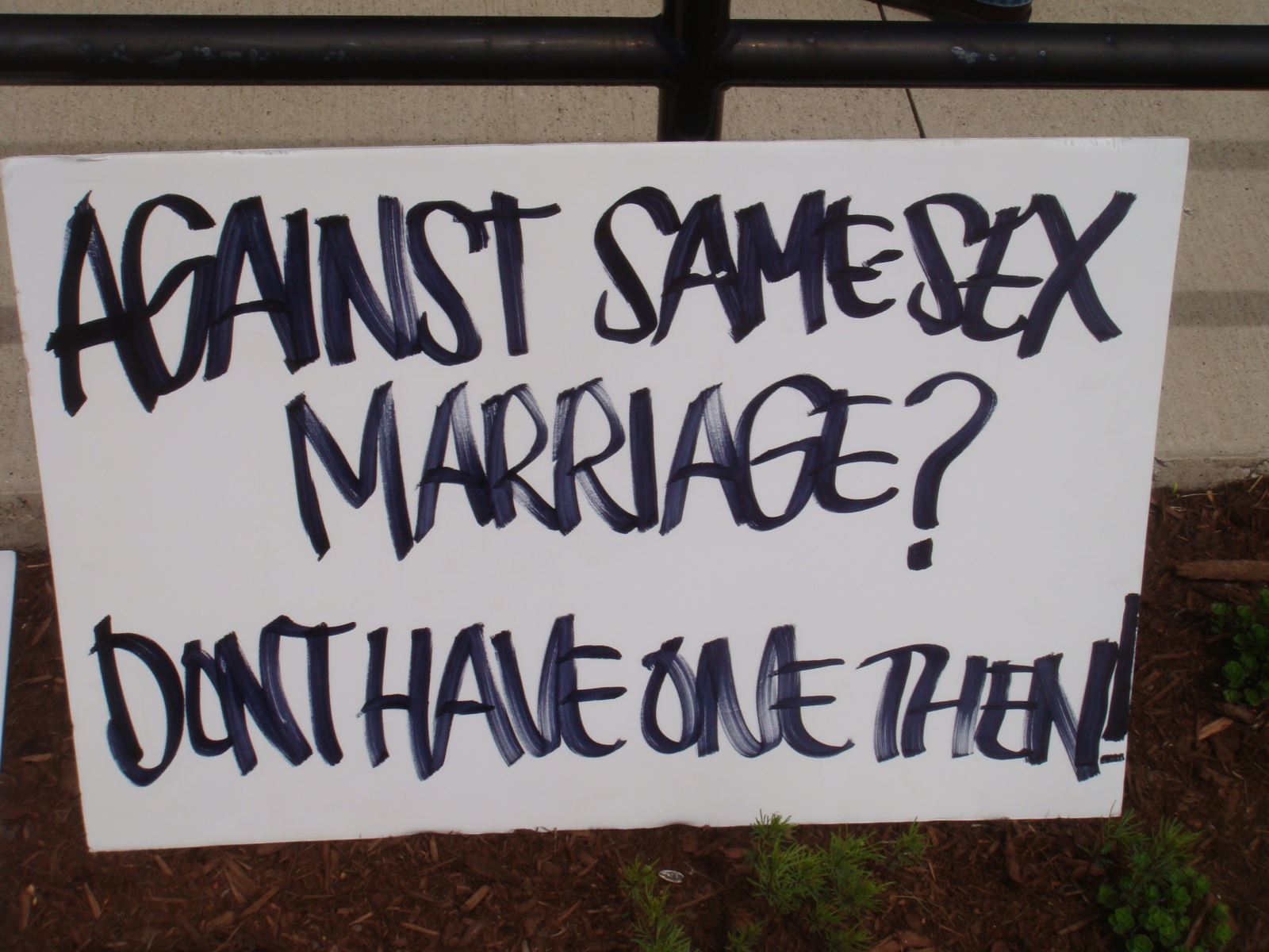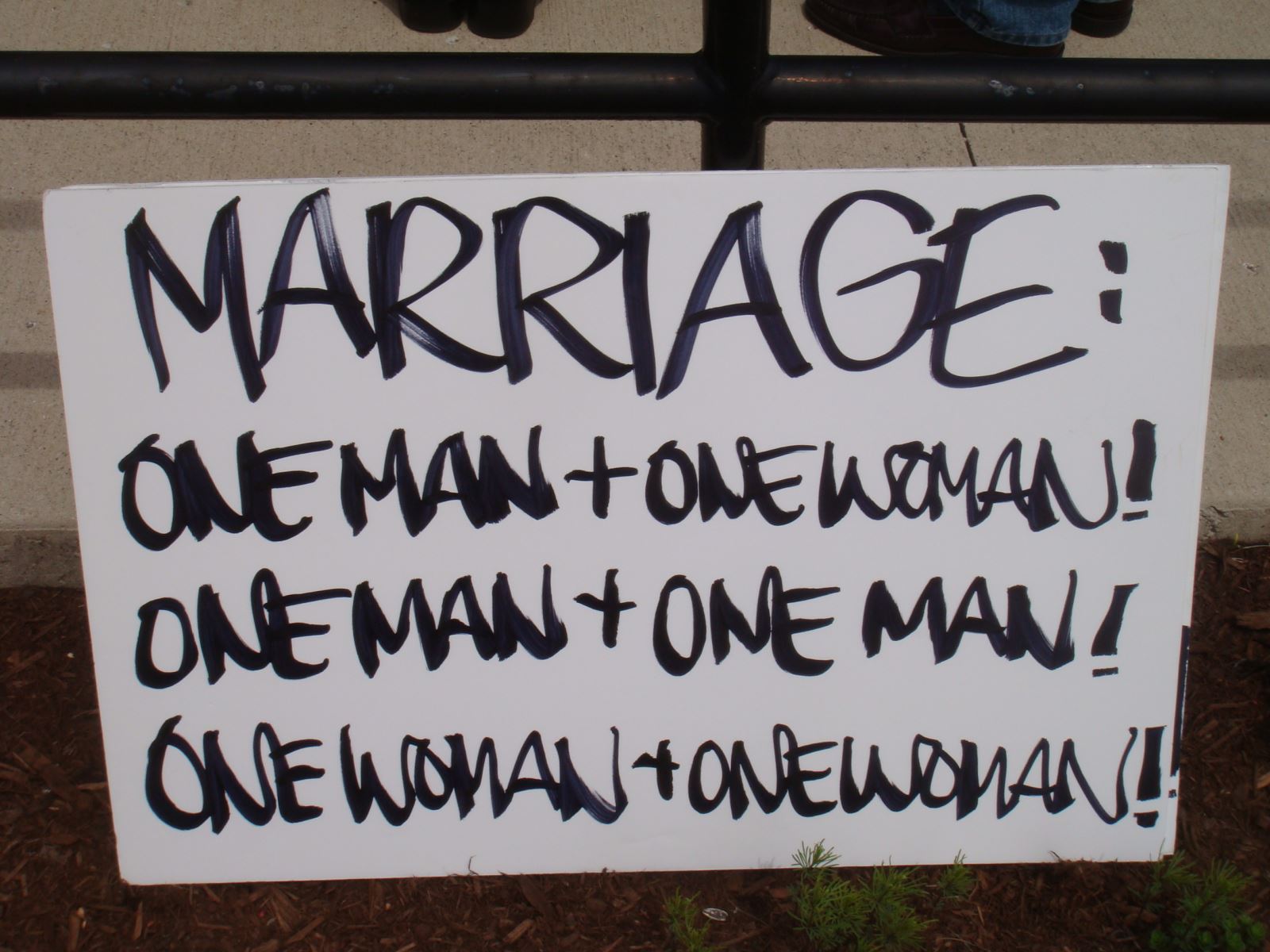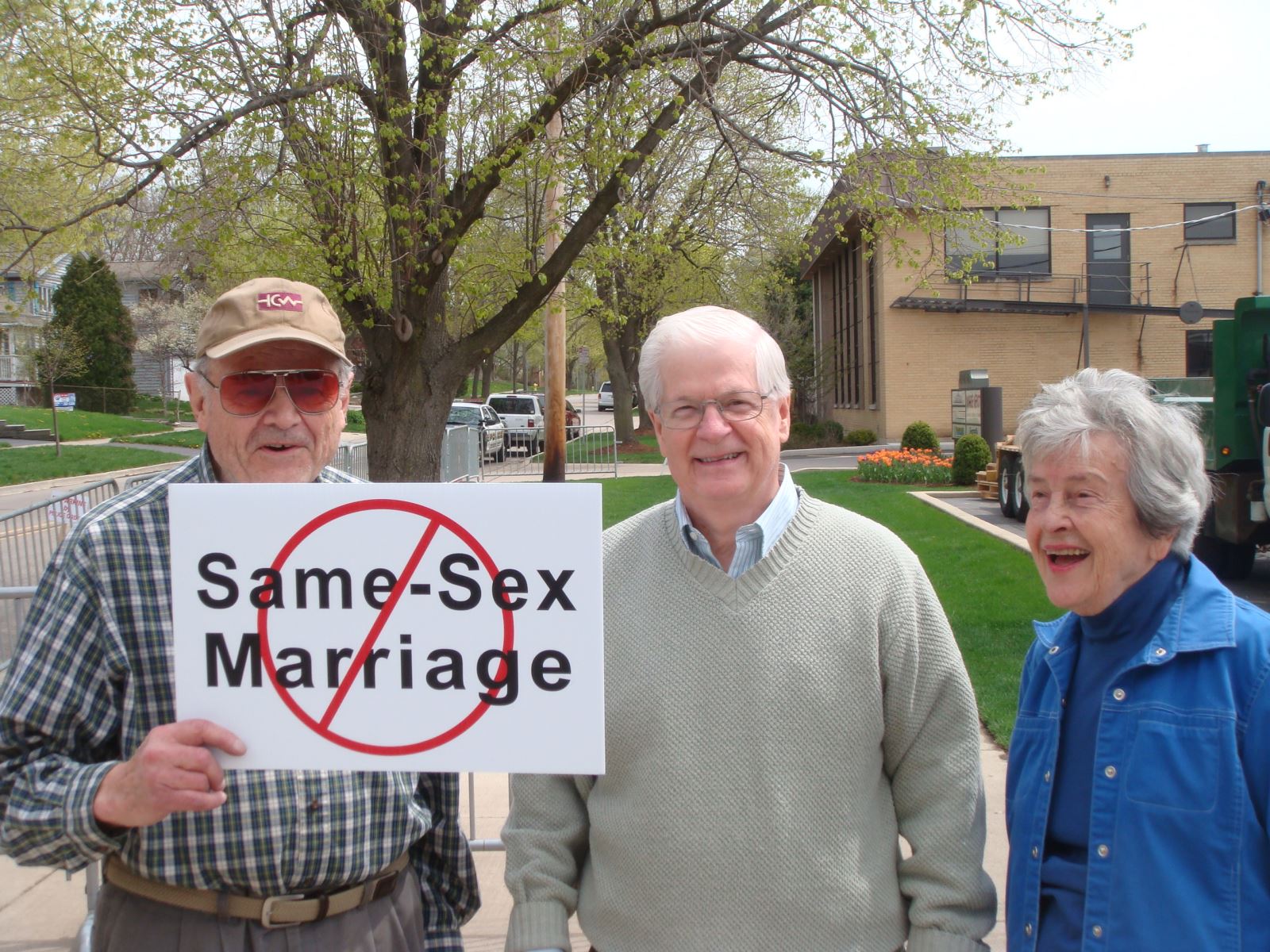 5月4日在伊利诺州Downers Grove召开的维护传统婚姻的聚会中,生命季刊王峙军牧师注意到有趣的一幕:两位老人家慢慢地从游行地点的街对面走过来,加入了维护传统婚姻的队伍中。但是他们两人持的标语牌,却写着支持同性恋婚姻的内容,一个牌子上写着:婚姻:一男一女,一男一男,一女一女;另一个牌子上写的,完全是同性恋者骂人的话。(见下图)
