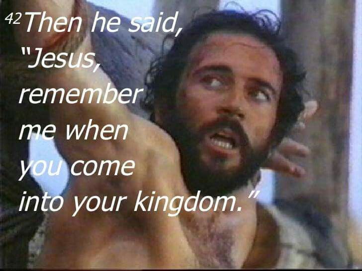 于是,当他听到同伴讥诮耶稣,他再也忍不住了,“你既是一样受刑的,还不怕神吗?我们是应该的。因我们所受的,与我们所作的相称。但这个人没有作过一件不好的事。”(路加福音23:40–41)然后他转向耶稣说,“耶稣啊,你得国降临的时候,求你记念我。”(路加福音23:42)