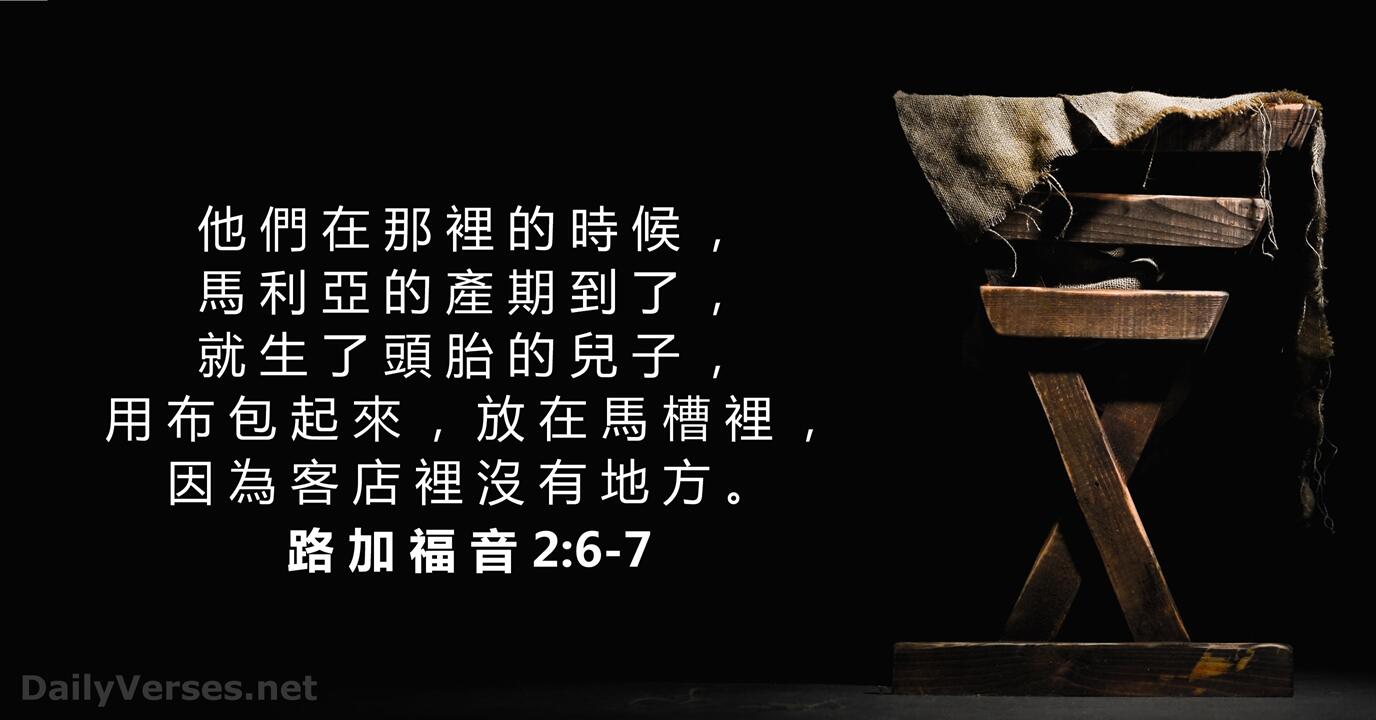 今日经文:“他们在那里的时候,马利亚的产期到了。就生了头胎的儿子,用布包起来,放在马槽里,因为客店里没有地方。”(路加福音2:6–7)