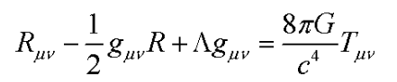 (注:广义相对论场方程左边是描述时空弯曲的爱因斯坦张量,方程右边的Tµν是能量-动量张量。爱因斯坦将引力场方程的理论和对行星轨道实际观测的结果相比较,得到方程中的比例常数为8πG/c4,其中G是牛顿的万有引力常数而c是光速)