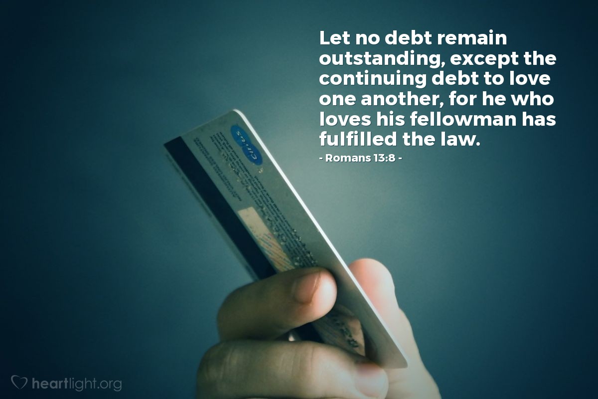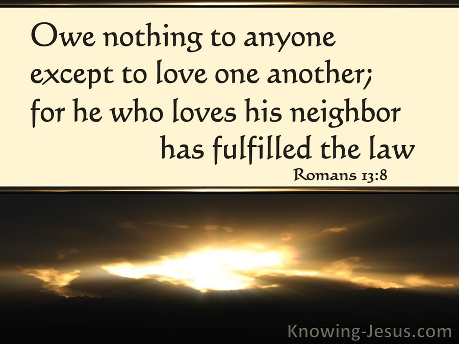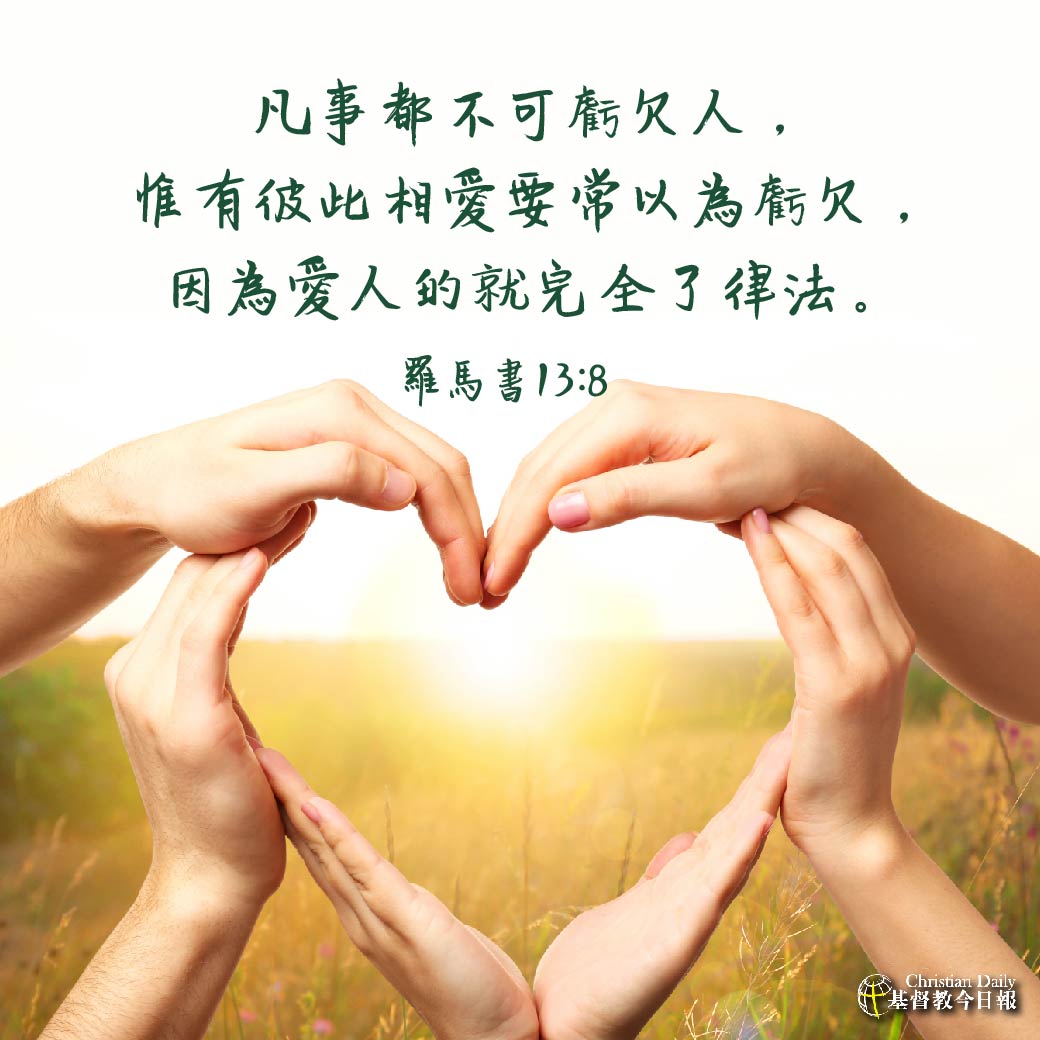 今日经文:“凡事都不可亏欠人,唯有彼此相爱,要常以为亏欠;因为爱人的就完全了律法。”(罗十三8)