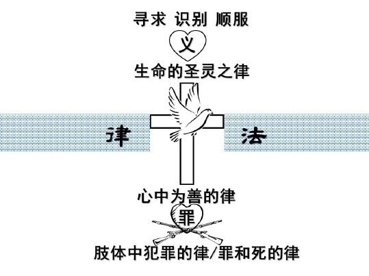 只有经过了不知多少次的失败和徘徊,我们才深刻地认识到罪的强大,认识到“自己心中立志为善的律”在“肢体中犯罪的律”(罗7:23)或“罪和死的律”(罗8:2)面前不堪一击,没有任何打赢的可能,没有任何得胜的可能。只有在这样的时刻,人才可能真正地谦卑俯伏,来到神的面前,寻求“生命圣灵的律”(罗8:2)。不再是自己立志为善,而是先来到神的面前,安静、警醒、谦卑、长时间地祷告,从耶稣基督并祂钉十字架和与主同钉十字架开始(如下图所示,参见于宏杰讲道集)。基督徒当然要立志为善,但这样的立志一定要来自神,而不是来自自己(腓2:13)。不先来到基督面前寻求神的旨意和圣灵的能力,就不可能有真正的圣洁(There is no true holiness without coming to Christ first)。7