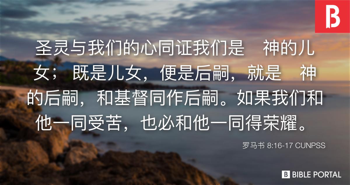 今日经文:13 你们若顺从肉体活着,必要死;若靠着圣灵治死身体的恶行,必要活着。 14 因为凡被神的灵引导的,都是神的儿子。 15 你们所受的不是奴仆的心,仍旧害怕;所受的乃是儿子的心,因此我们呼叫:“阿爸!父!” 16 圣灵与我们的心同证我们是神的儿女。(罗8:13–16)
