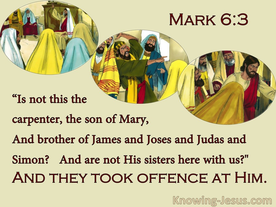今日经文:耶稣离开那里,来到自己的家乡,门徒也跟从祂。到了安息日,祂在会堂里教训人,众人听见就甚希奇,说,“这人从那里有这些事呢?所赐给祂的是什么智慧?祂手所作的是何等的异能呢?这不是那木匠吗?不是马利亚的儿子,雅各、约西、犹大、西门的长兄吗?祂妹妹们不也是在我们这里吗?”他们就因祂跌倒。(可6:1–3)