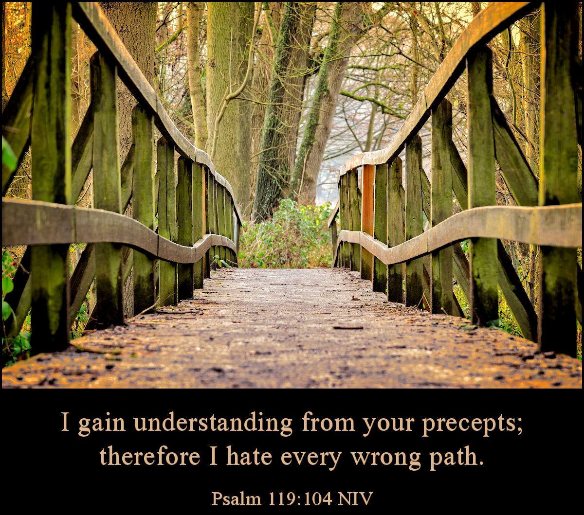 今日经文:“我禁止我脚走一切的邪路,为要遵守你的话。我没有偏离你的典章。因为你教训了我。你的言语,在我上膛何等甘美,在我口中比蜜更甜。我借着你的训词,得以明白。所以我恨一切的假道。”(诗篇119:101–104)