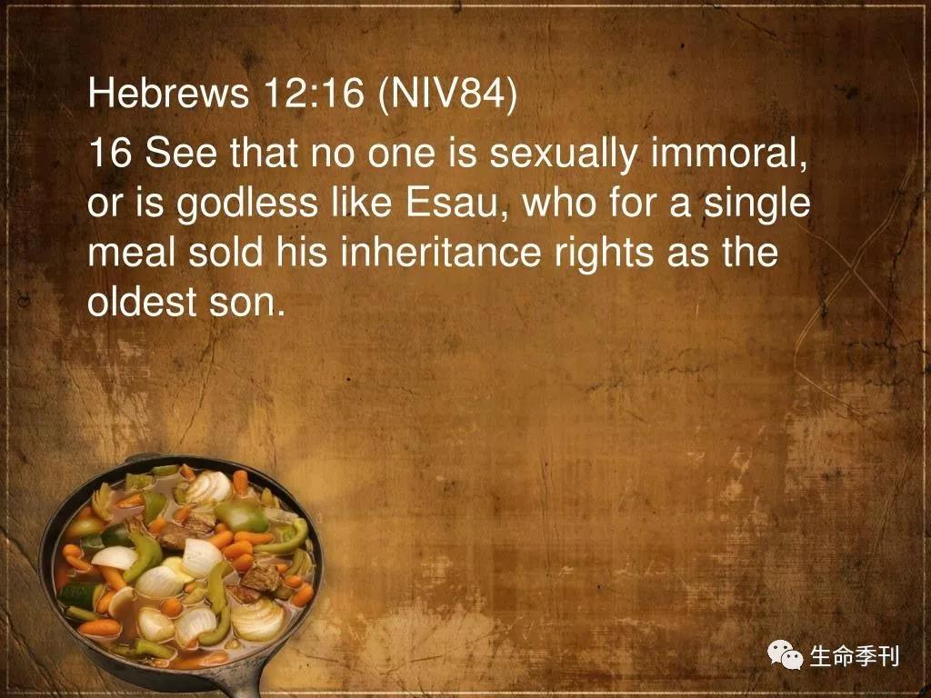 圣经常将一些典型的人或事,作为反面教训屡屡提及,为要引起神子民当有的警戒。以扫就是其中的一个。今天,我们从以扫“轻看长子名份”这件事上,思想神看重人的哪一点,思想神为什么会在立约的关系上恶他、不爱他、不拣选他。