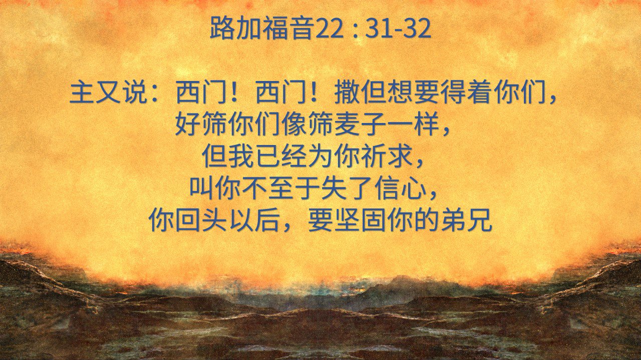 “主又说:西门,西门,撒但想要得着你们,好筛你们像筛麦子一样,但我已经为你祈求,叫你不至于失了信心,你回头以后,要坚固你的弟兄。”(路加福音22:31–32)
