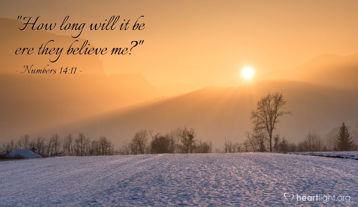 今日经文:“耶和华对摩西说,这百姓藐视我要到几时呢?我在他们中间行了这一切神迹,他们还不信我要到几时呢?我要用瘟疫击杀他们,使他们不能承受那地,叫你的后裔成为大国,比他们强盛。”(民14:11–12)