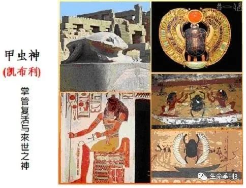 埃及有一个神叫做早晨的太阳神(凯布利),这个太阳神的标记就是甲虫,跟青蛙一样是神圣的动物。在古埃及神话中甲虫属于创造之神,代表着太阳在天空的运行,埃及人认为甲虫象征创造、复活和来世。在金字塔文献中有不少圣甲虫的记述。古埃及人在制作木乃伊过程中,会将甲虫放在木乃伊的心脏位置,作用是驱邪避恶。古埃及人将甲虫视为幸运物,非常重视喜爱。