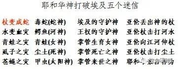 第七章和第八章记载耶和华神以一个神迹和四个灾难显现在法老面前,展示神的大能,就是要让法老和埃及人认识“我是耶和华”;另外有一个重要的目的,就是要打破埃及最有影响力的五个偶像,眼镜蛇、鳄鱼、青蛙、尘土和甲虫,也就是蛇神、河神、女神、死神和太阳神。