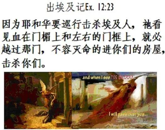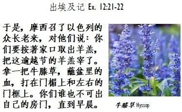 耶和华神在降灾那天晚上巡行埃及的时候,只要看见家门上有这个完整的记号就会越过去,灭命的天使就不会进屋子里去,里面的人和动物就没事了。所以这里很清楚,巡行的是神,执行击杀命令的是灭命的天使。所有的长老要回到各个家族去宣布这件事,他们每个家庭都必须马上派人出去收集牛膝草。以色列人过去每天都要出去找草做砖,所以找牛膝草这件事情并不困难。