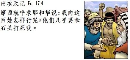 摩西无法控制场面,就呼求神帮助,他说不知道该怎么办,因为百姓这次没水喝,争闹的程度比前次在玛拉更加厉害,他们甚至想要用石头打死摩西。这些百姓表面上对摩西抱怨,出言不逊,实际上他们是对耶和华神不满。