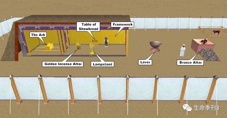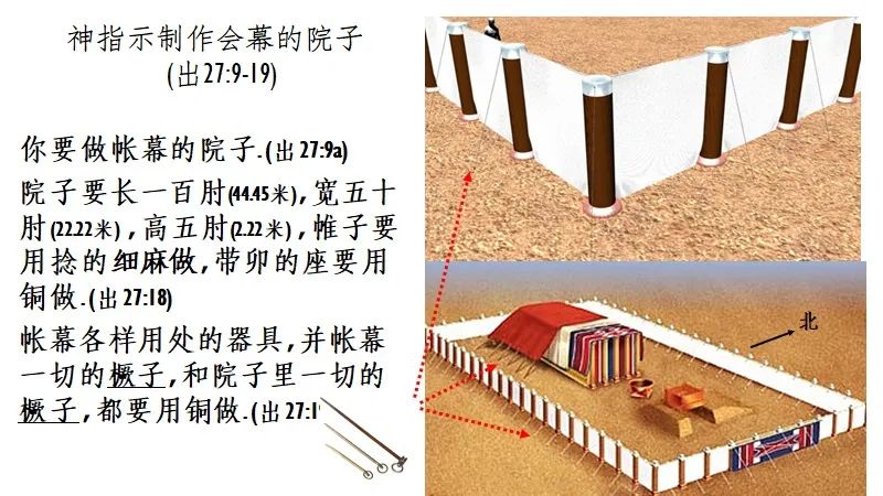 院子四周所有的的柱子都是皂荚木的质料,都要用银杆连起来,柱子上有银钩子,带卯的座是铜做的。院子一转的帷子高度都是五肘,所以一般人从帷子外面是看不到院子里面的情况。另外帐幕各种器具,所有帐幕和院子用的橛子,都要用铜来制造。这里我们已经看到百姓所献上大量的金银铜,皂荚木,羊毛,皮革,线,麻布全都派上用场。