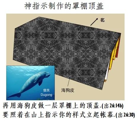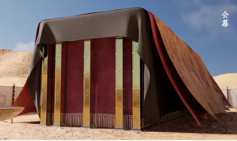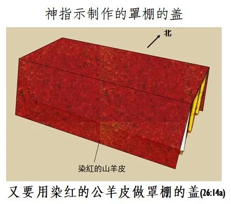 第三层是用公羊皮做成的盖子,是红色的,盖过罩棚。盖子两边还要用绳子向两边拉撑,用撅子固定在地上,让盖子两边长度对称。最上层是用海狗皮做成的顶盖。不像细麻或羊毛是用织的,可以一幅一幅连起来,动物皮不论是山羊皮或海狗皮都必须要先处理染色修剪,然后一片一片缝成一大片,所以帐幕的盖和顶盖都是用整张缝合的皮革按照会幕的尺寸裁制出来的。顶盖也是两边用绳子向两边拉撑对称,用撅子固定在地上。当帐幕制造完成,立起来以后,大概就是图片中模型的这个样子。