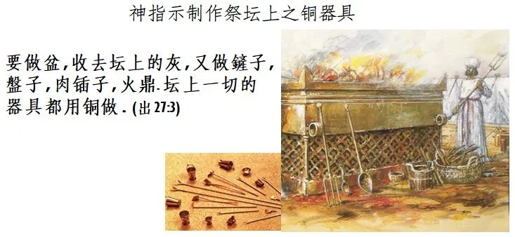 祭坛也有附带的工具,有盆子,用来收坛上祭物烧完了的灰;有铲子、盘子、肉锸子、火鼎,都是处理祭物和材火用的,这些器具的材料都是纯铜。祭坛里面中间半腰的有一个方的铜网,在网的四角上做四个铜环,像约柜和陈设饼桌一样,用皂荚木做长杠,用铜来包裹。这杠就要穿过铜环,祭坛就可以抬着走。祭坛下面就是柴火,祭物就是放在铜网上焚烧。祭坛是祭司在会幕外院献祭时最重要的设备,神对祭坛献祭有很严谨的规定,摩西在利未记有完整的记载。