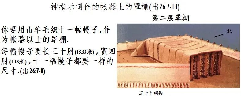 第二层帐幕的幕幔叫做罩棚,是用山羊毛织出来的,这就比细麻织的厚重很多,罩棚是11幅长条型的幔子连成,每一幅长30肘宽4肘。前五幅连成一大幅,后六幅连成一大幅,两大幅中间也是各用50个钮扣,两两相对,另外做50个铜钩把这两大幅连成一个44肘乘30肘长方型的罩棚。比第一层帐幕大一些。多出来4肘长的部分要垂在帐幕的前面,也就是东面,宽的部分两边各多1肘就盖过第一层并且垂到地上。