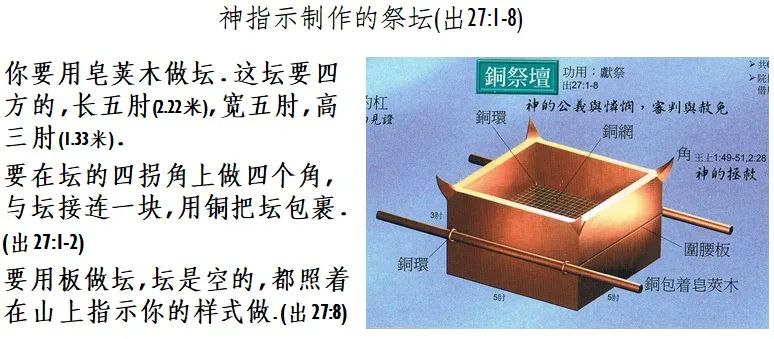 在会幕东面进口外面有一个铜祭坛,是用皂荚木木板做成,长宽都是五肘,高三肘,坛是中空的。坛上面有4个角,祭坛因为要烧火,焚烧祭物,所以整个木质部分都要用铜箔包裹起来防火。