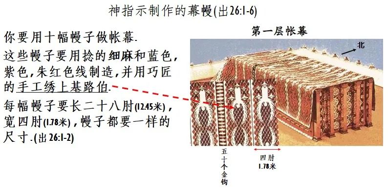 这种编织组合的方法非常有智慧,因为这样编织才整齐美观,最重要的是整块幕幔不容易变形。如果其中有某几幅损坏,可以拆掉更换而不必全部重做。要把这个连成的幕幔搭在会幕的主结构上。会幕长30肘所以幕幔有10肘会垂到会幕的后面。会幕的宽加上两边的高一共29肘,所以28肘宽的幕幔盖下去,两边拉到对称,都不会垂到地上,南北两长边竖版的银基座会露出来。这是第一层的帐幕。