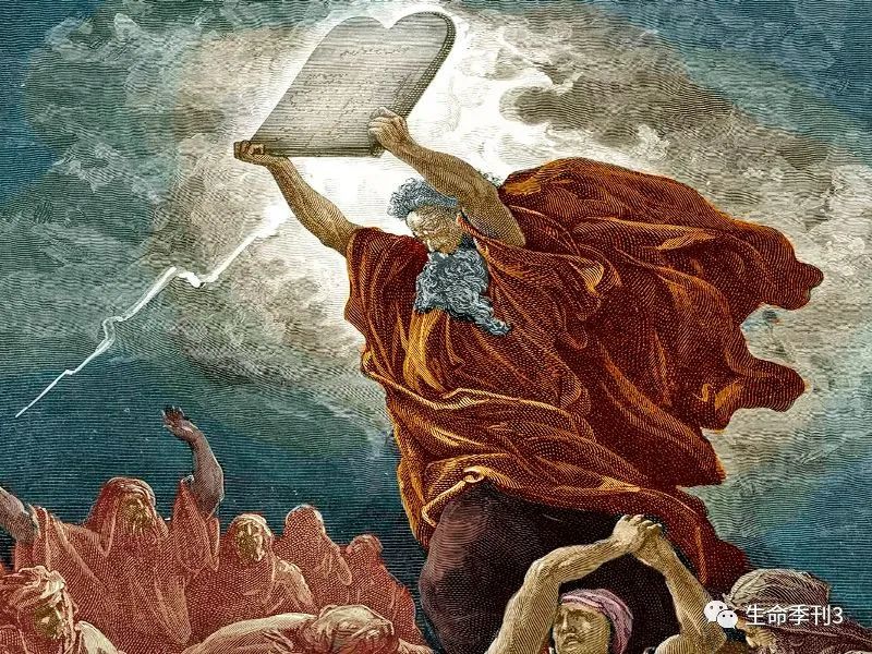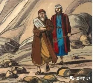“摩西转身下山,手里拿着两块法版。这版是两面写的,这面那面都有字,是神的工作,字是神写的,刻在版上。约书亚一听见百姓呼喊的声音,就对摩西说:在营里有争战的声音。摩西说:这不是人打胜仗的声音,也不是人打败仗的声音,我所听见的乃是人歌唱的声音。”(32:15–18)