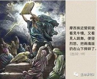 摩西挨近百姓安营的地方,一眼就看见金牛犊高高矗立在百姓的营中,又看见一群百姓在金牛犊面前手舞足蹈欢乐,无非就是模仿埃及人向偶像膜拜的动作。摩西当下就发烈怒,和神在山上“发烈怒”是同一个字,原文的形容是极大的怒火。摩西下山前求神不要发烈怒,神没有答应,他现在明白是为什么了。