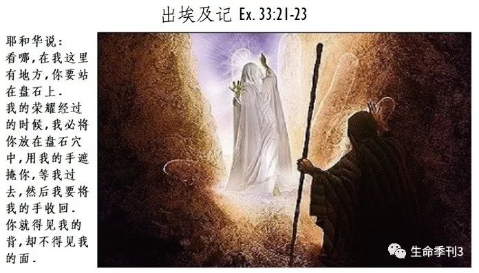 “耶和华说:看哪,在我这里有地方,你要站在磐石上。我的荣耀经过的时候,我必将你放在磐石穴中,用我的手遮掩你,等我过去,然后我要将我的手收回,你就得见我的背,却不得见我的面。”(33:21–23)