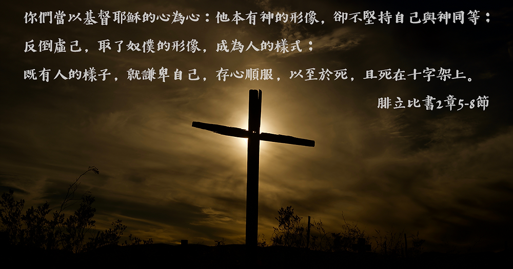 “祂本有上帝的形象,不以自己与神同等为强夺的;反倒虚己,取了奴仆的形象,成为人的样式;既有人的样子,就自己卑微,存心顺服,以至于死,且死在十字架上。”(腓立比书2:6–8)