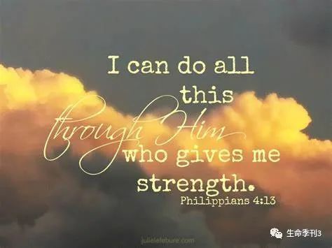 “我并不是因缺乏说这话,我无论在什么景况,都可以知足,这是我已经学会了;我知道怎样处卑贱,也知道怎样处丰富,或饱足,或饥饿,或有余,或缺乏,随事随在,我都得了秘诀。我靠着那加给我力量的,凡事都能作。”(腓4:11–13)