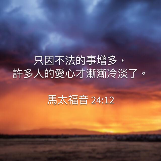 今日经文:“只因不法的事增多,许多人的爱心,才渐渐冷淡了。”(太24:12)