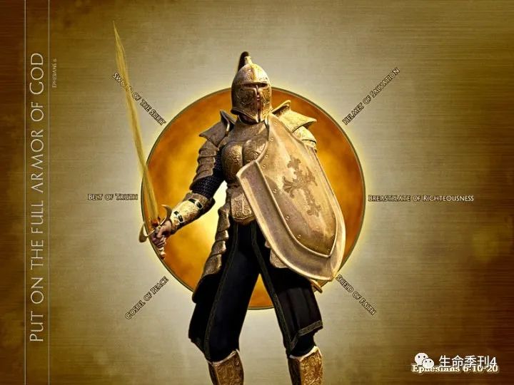“要拿起神所赐的全副军装,好在磨难的日子抵挡仇敌;并且成就了一切,还能站立得住。所以要站稳了,用真理当作带子束腰,用公义当作护心镜遮胸,又用平安的福音,当作预备走路的鞋穿在脚上。此外又拿着信德当作藤牌,可以灭尽那恶者一切的火箭。并戴上救恩的头盔,拿着圣灵的宝剑,就是神的道,靠着圣灵,随时多方祷告祈求,并要在此儆醒不倦、为众圣徒祈求。”(弗6:13–18)