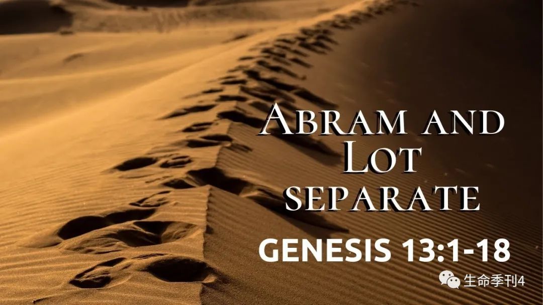 “亚伯兰带着他的妻子与罗得,并一切所有的,都从埃及上南地去。亚伯兰的金、银、牲畜极多。他从南地渐渐往伯特利去,到了伯特利和艾的中间,就是从前支搭帐篷的地方。也是他起先筑坛的地方,他又在那里求告耶和华的名。与亚伯兰同行的罗得也有牛群、羊群、帐篷。那地容不下他们,因为他们的财物甚多,使他们不能同居。当时,迦南人与比利洗人在那地居住。亚伯兰的牧人和罗得的牧人相争。亚伯兰就对罗得说:“你我不可相争,你的牧人和我的牧人也不可相争,因为我们是骨肉。遍地不都在你眼前吗?请你离开我。你向左,我就向右;你向右,我就向左。”罗得举目看见约旦河的全平原,直到琐耳,都是滋润的,那地在耶和华未灭所多玛、蛾摩拉以先,如同耶和华的园子,也像埃及地。于是罗得选择约旦河的全平原,往东迁移,他们就彼此分离了。亚伯兰住在迦南地,罗得住在平原的城邑,渐渐挪移帐篷,直到所多玛。所多玛人在耶和华面前罪大恶极。罗得离别亚伯兰以后,耶和华对亚伯兰说:“从你所在的地方,你举目向东西南北观看,凡你所看见的一切地,我都要赐给你和你的后裔,直到永远。我也要使你的后裔如同地上的尘沙那样多,人若能数算地上的尘沙,才能数算你的后裔。你起来,纵横走遍这地,因为我必把这地赐给你。”亚伯兰就搬了帐篷,来到希伯伦幔利的橡树那里居住,在那里为耶和华筑了一座坛。