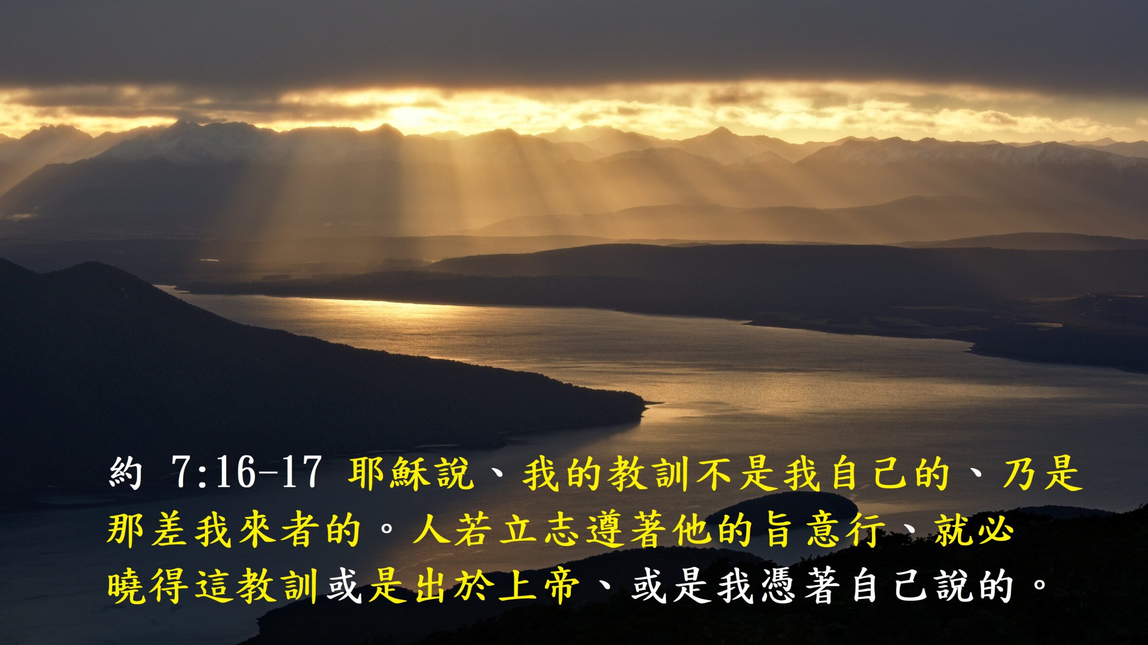 “人若立志遵着祂的旨意行,就必晓得这教训或是出于神,或是我凭着自己说的。人凭着自己说,是求自己的荣耀。惟有求那差祂来者的荣耀,这人是真的,在祂心里没有不义。”(约7:17–18)